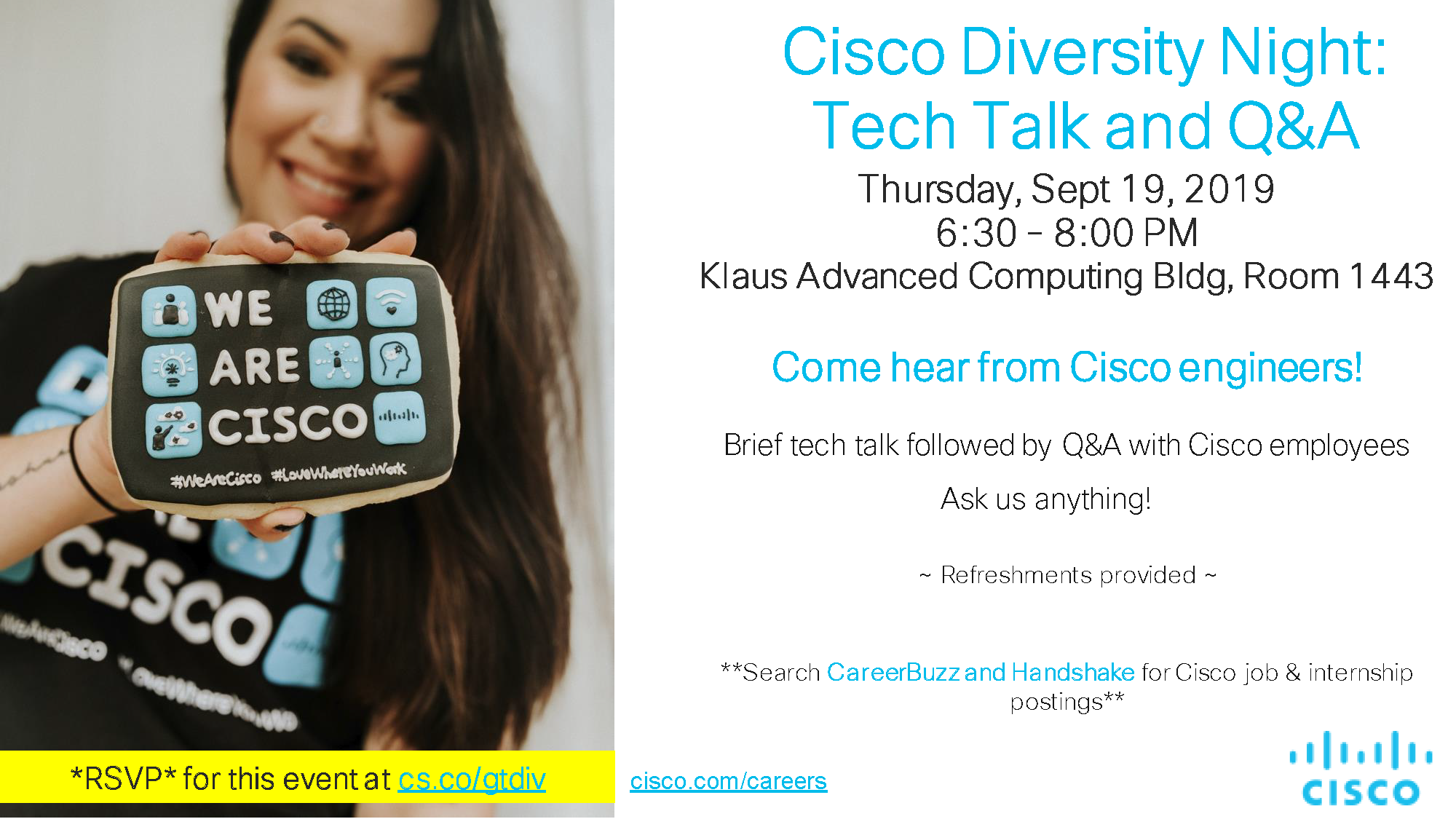 Join Cisco engineers for a brief tech talk followed by Q&A! Date: Thursday, September 19 Time: 6:30pm Location: Klaus 1443 RSVP: https://jobs.cisco.com/jobs/EventDetailNL?projectId=1269391 [cid:image001.png@01D56E47.221A9B00]<https://jobs.cisco.com/jobs/EventDetailNL?projectId=1269391>