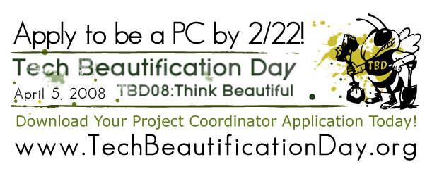 Hey Guys! Tech Beautification Day will be held on April 5 this year. The day comprises of different groups coming in together and performing various community service projects on and off campus both. Every volunteer will get approved service hours, a free T-shirt and free food in the morning and afternoon celebrations. Our Project Coordinator applications are out and the deadline for the same is February 22. I have attached the flyer with this email for more information. The website you are looking for is: www.gttbd.org or www.techbeautificationday.org Group Registeration starts from 2/25 till 3/7 and volunteer registeration starts from 3/10 - 4/5. Let me know if you have any questions and I hope to see a LOT of participation from all of you! Thanks! Mansi Director of Project Development TBD '08 -- Mansi Sharma Computer Science Georgia Institute of Technology