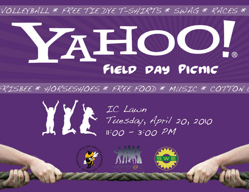 Good morning girls, TGIF! The end of the semester's approaching; I hope everyone's hanging in there! One of our final events for the semester is the Yahoo! Field Day picnic this coming Tuesday, April 20 from 11-3p. If you could come by, even for just a little while, before and after the event for set-up and clean-up, please email me your availability. Also, don't forget to advertise the event and bring your friends! Thanks, and have a great day! -- Candis Pham B.S. Computational Media Georgia Institute of Technology