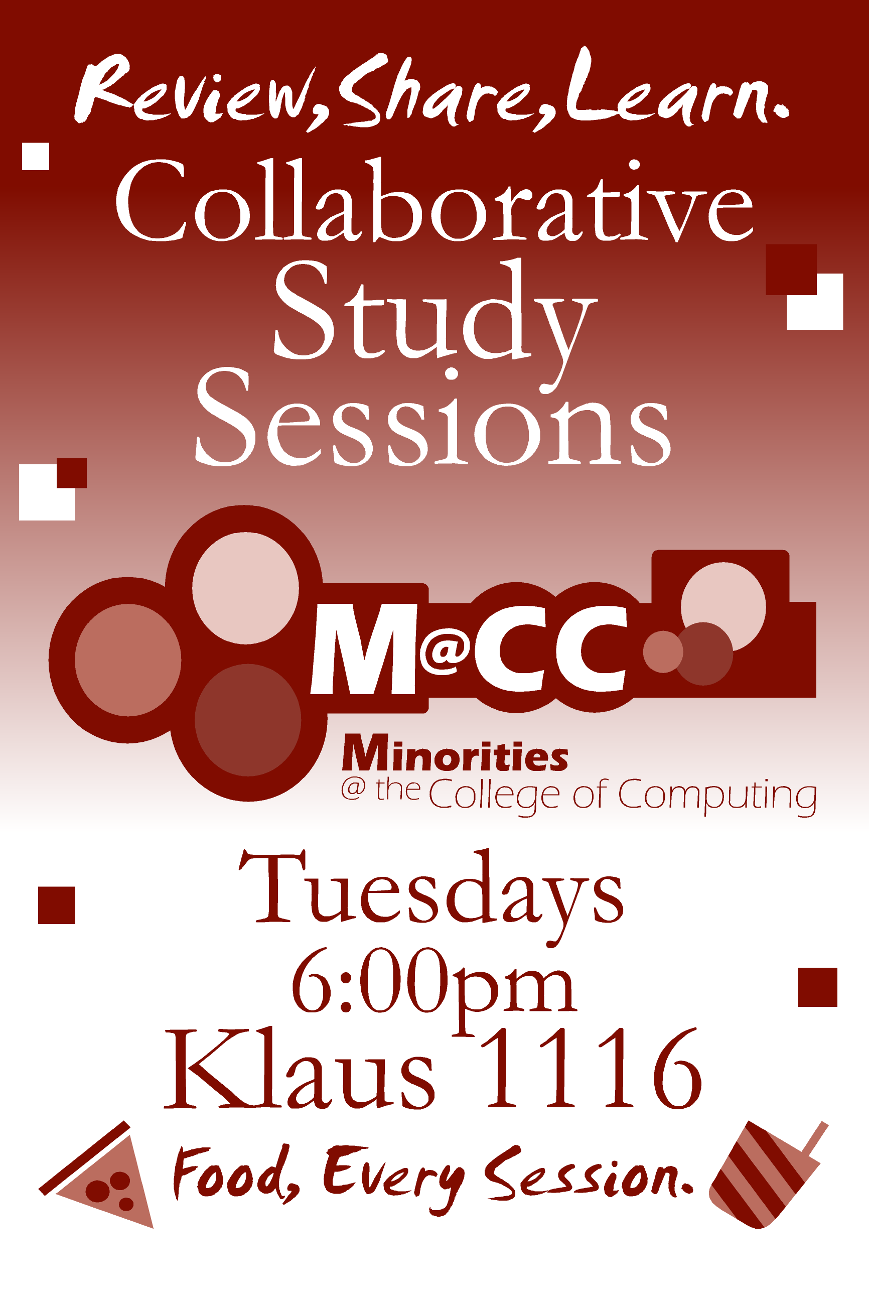 Hi All, M@CC(minorities at the college of computing) is holding academic study sessions from 6-8pm in Klaus 1116. The purpose of study session is to provide an opportunity for COC students to reap the benefits of collaborative learning. Everyone needs a little help now and then and often the best help is given and received from fellow classmates. Please come out and join us for M@CC's academic study sessions so we can support each other in the area that counts most: Academics! Deidrick Capers M@CC Academic Chair Refreshments will be served; first come first serve