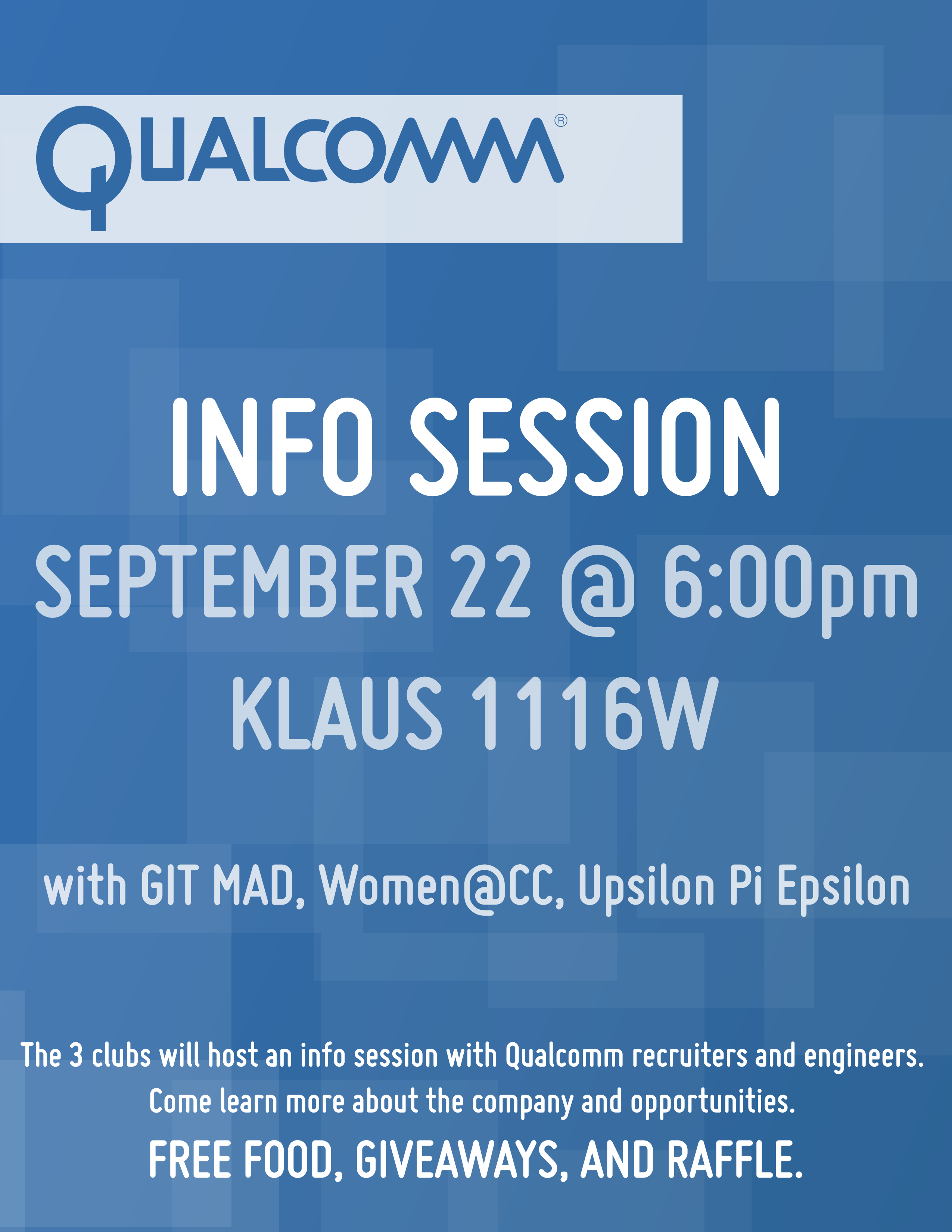 Hey everyone, Please don't forget -- TONIGHT, GIT MAD, W@CC, and UPE will be hosting an info session for Qualcomm, one of the CoC's newest sponsors. This is a great opportunity for students too come and learn about what Qualcomm does, their experiences with the company, and what positions they are currently looking to fill. Also, there will be giveaways, expensive raffles, and lots of FREE food! What: Qualcomm Information Session When: TONIGHT, Wednesday, September 22, 6:00p - 7:30p Where: Klaus 1116W Attached is a flyer for the event. Thank you, and we hope to see you there! -- Candis Pham B.S. Computational Media 2011 Georgia Institute of Technology