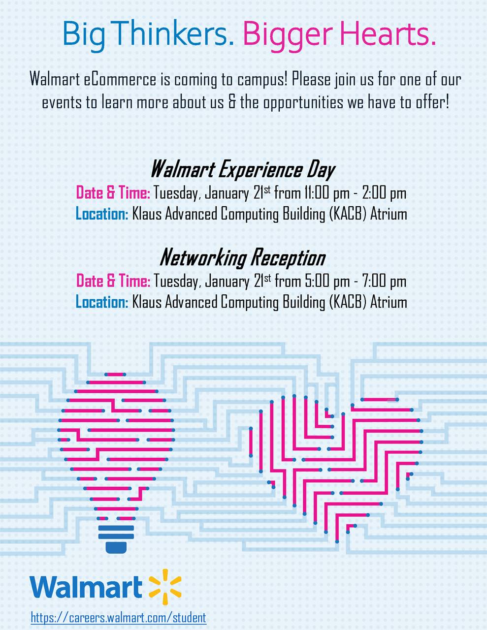 Join Walmart engineers, hiring managers and recruiters for a night of networking at their reception on Tuesday, January 21 from 5pm-7pm in Klaus Atrium! Date: Tuesday, January 21 Time: 5pm-7pm Location: Klaus Atrium RSVP: https://gatech.co1.qualtrics.com/jfe/form/SV_es0LYFlFCLFO0UR [cid:image003.jpg@01D5CC66.88050AE0]<https://gatech.co1.qualtrics.com/jfe/form/SV_es0LYFlFCLFO0UR>