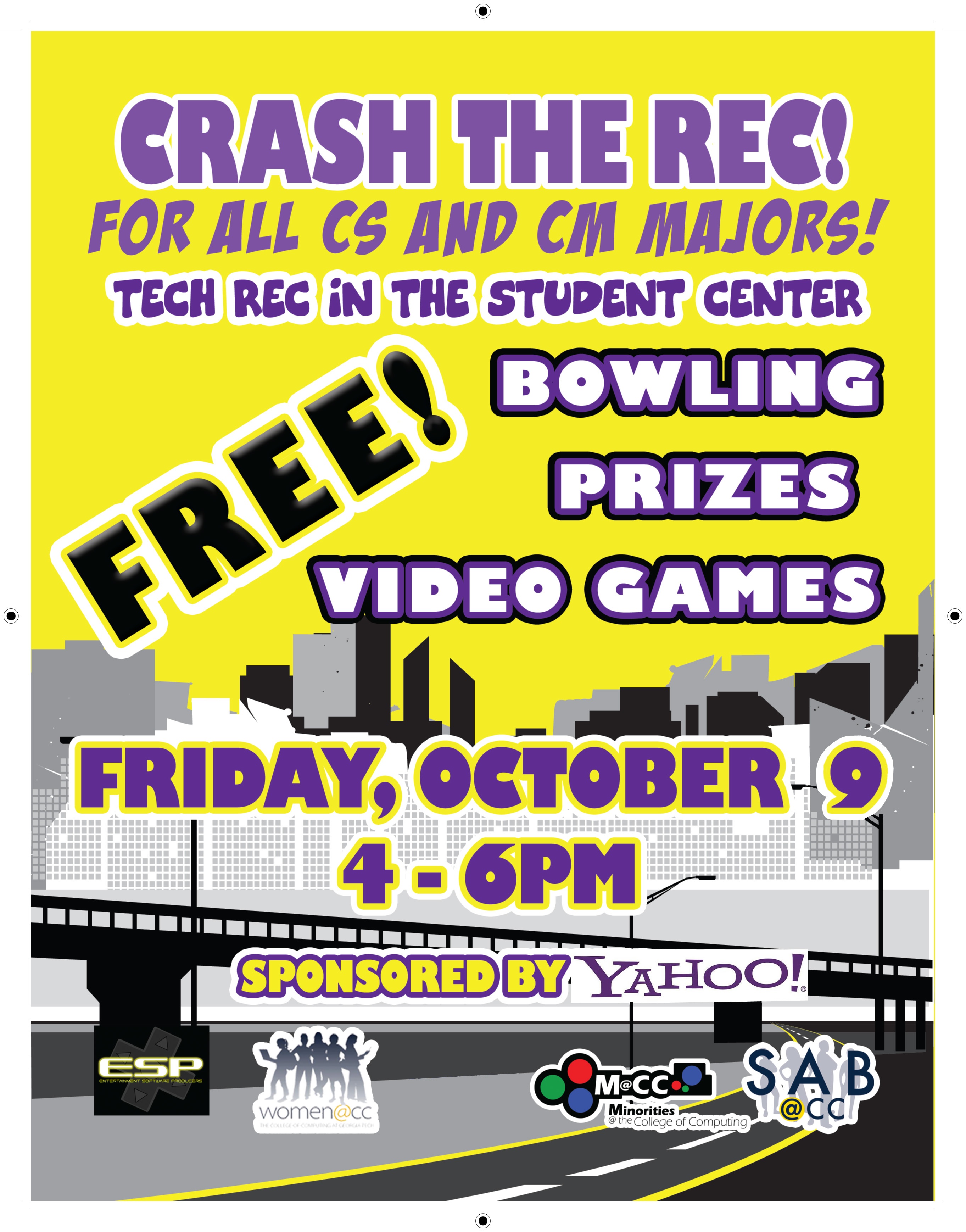 This Friday, your Student Activities Board (SAB) will be hosting this year's Crash the Rec sponsored by Yahoo!! Come get food, play games, meet people, and win prizes, all for free. What: SAB Crash the Rec, sponsored by Yahoo!, with the help of Minorities@cc, Women@cc, and ESP When: Friday, October 9, from 4 to 6 PM Where: Tech Rec, in the Student Center Who: all CS and CM undergrads Cost: free Questions? Contact me at jcohen@gatech.edu. See you all there! -Jon Cohen College of Computing Georgia Institute of Technology Student Activities Board Chair FIRST Robotics Web Site judge
