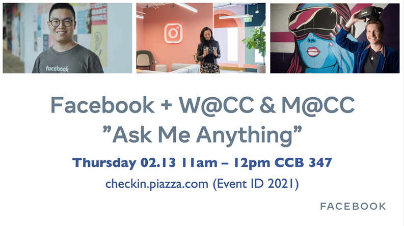 Join the Facebook team for an "Ask Me Anything" luncheon event to meet with software engineers representing various teams and office locations - a great chance to ask any questions you may have about positions at Facebook, recruiting process, a day in the life etc. Lunch will be provided - hope to see you there! Facebook + W@CC & M@CC "Ask Me Anything" Luncheon Date: Thursday, February 13th Time: 11am-12pm Location: CCB 347 RSVP: https://gatech.co1.qualtrics.com/jfe/form/SV_0cv5OBpo2kHWOSF<https://urldefense.proofpoint.com/v2/url?u=https-3A__gatech.co1.qualtrics.com_jfe_form_SV-5F0cv5OBpo2kHWOSF&d=DwMFaQ&c=5VD0RTtNlTh3ycd41b3MUw&r=v_MH5epQyfXa9aEqMYO_8Q&m=PhwaxsWxMXiDakavdEKHm3Xccvs2v5OfZPoGArnak8M&s=M886Ahx1cmyaWiAP2Frg3LeYX5CebfdqcOChEH6uX4o&e=> [cid:image001.png@01D5E026.0ACD6670]<https://gatech.co1.qualtrics.com/jfe/form/SV_0cv5OBpo2kHWOSF>