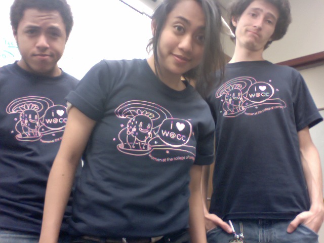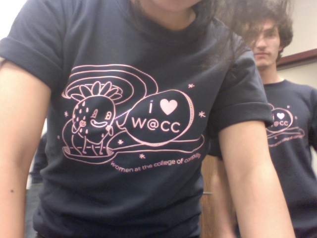 Hi everyone (: this is Dannielle with the announcement: W@CC T-Shirts are in! Attached are two little shots of the shirt. If you've ordered a t-shirt, come by the CoC third floor at a time in which I'm around to pick it up: I will be around all weekend, so just call me, Dannielle, at 770 833 9841. I'll be around... a lot. All weekend! All finals week! Yeah! Don't forget to keep W@CC in your thoughts this summer: if you're available to help out at FASET for recruitment, get in touch with Leah Criscolo or keep an eye out for upcoming emails. Once again, W@CC wishes you a wonderful finals week full of rest, luck, focus, and grace, and W@CC thanks you for a great semester. We will be so happy when we see you next semester. [women at cc]