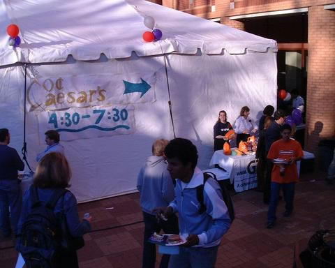 I know .. i know.. this is the zillionth time I am mailing today but nevertheless, I was walking in front of COC and I was thinking.. we should put up a huge sign saying 'CoCeasars palace Thursday 5 to 8 ....' or something like that outside the tent facing the road as soon as possible.