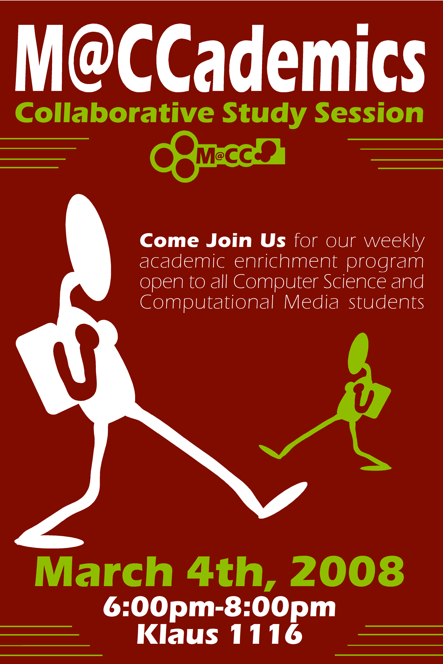 Come join M@CC <mailto:M@CC> at their weekly Collaborative Study Session open to all CS and CM students... See attached flyer for details! Refreshments will be served... Vickie L. Suggs Manager, Retention Initiatives and Community College of Computing The Georgia Institute of Technology Atlanta, GA 30332-0280 404.385.2273 (office) 404.385.0965 (fax) vickie@cc.gatech.edu <mailto:wdp@cc.gatech.edu>