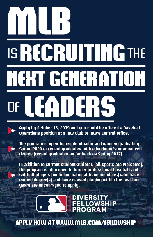 The program is open to upcoming 2020 graduates or recent graduates (as far as back Spring 2017 graduates). While all disciplines are eligible to apply, we strongly encourage candidates with degrees or knowledge in economics, analytics, computer science, applied mathematics, law and business to submit applications. For more information about the Major League Baseball Diversity Fellowship Program and to apply, candidates can go to www.mlb.com/fellowship<http://www.mlb.com/fellowship>. The application deadline is Friday, October 15, 2019.